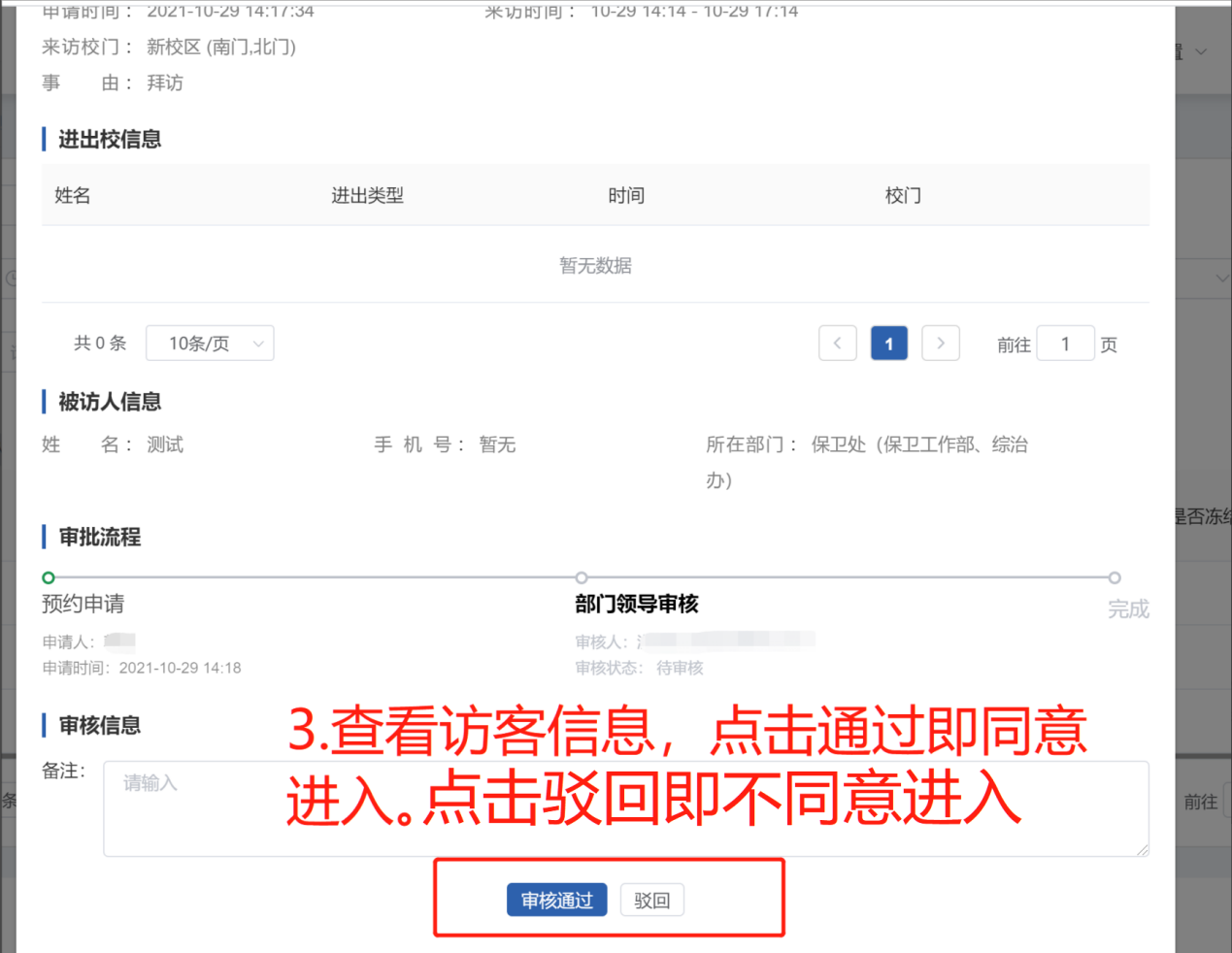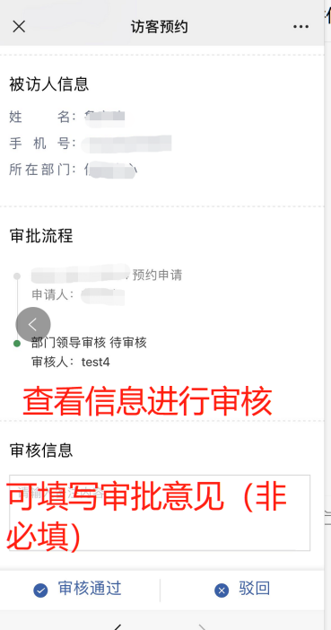 进入访客预约审核页面,选中待审核的流程,可以进行访客发起的流程谁审核