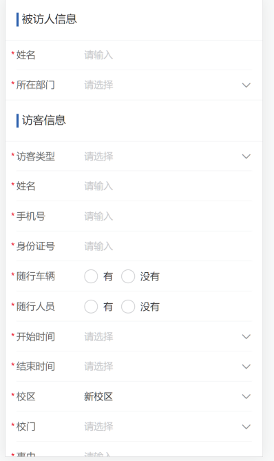 1)访客类型【必填】:下拉选择(长期访客、临时访客),不同类型访客可预约时长不同;