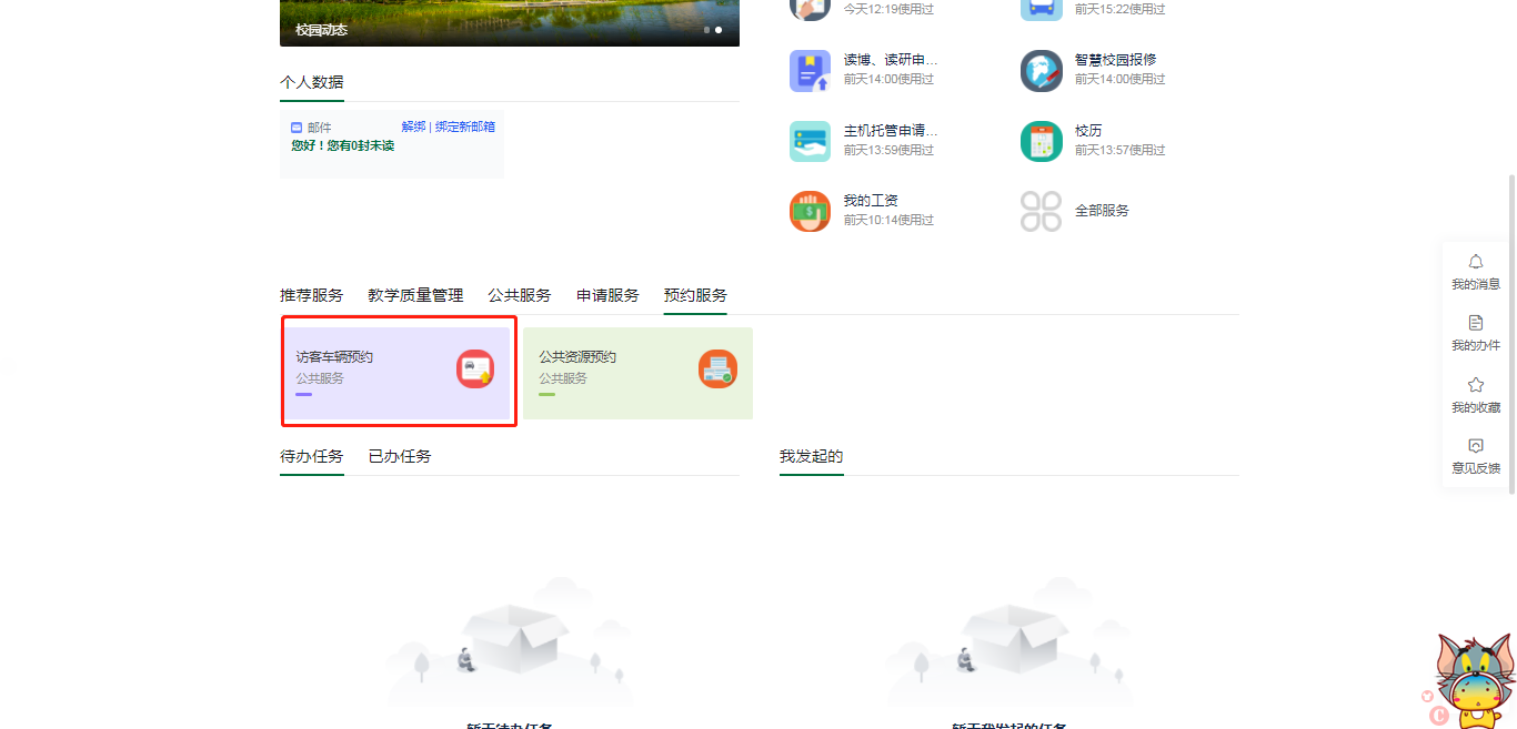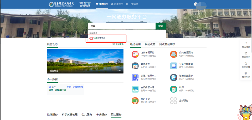 登入一网通办平台后,可在搜索框中搜索“访客车辆预约”关键字,在列出的服务列表点击进入,也可在我的大学—》预约服务——》访客车辆预约点击进入;