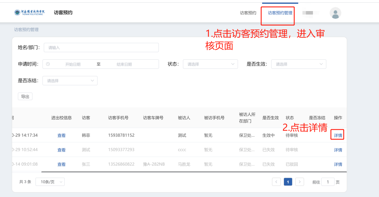 部门管理员/保卫处管理员可以根据姓名/部门、申请时间、状态、是否生效、是否冻结多维度查看到管理的部门的申请信息,并进行审核