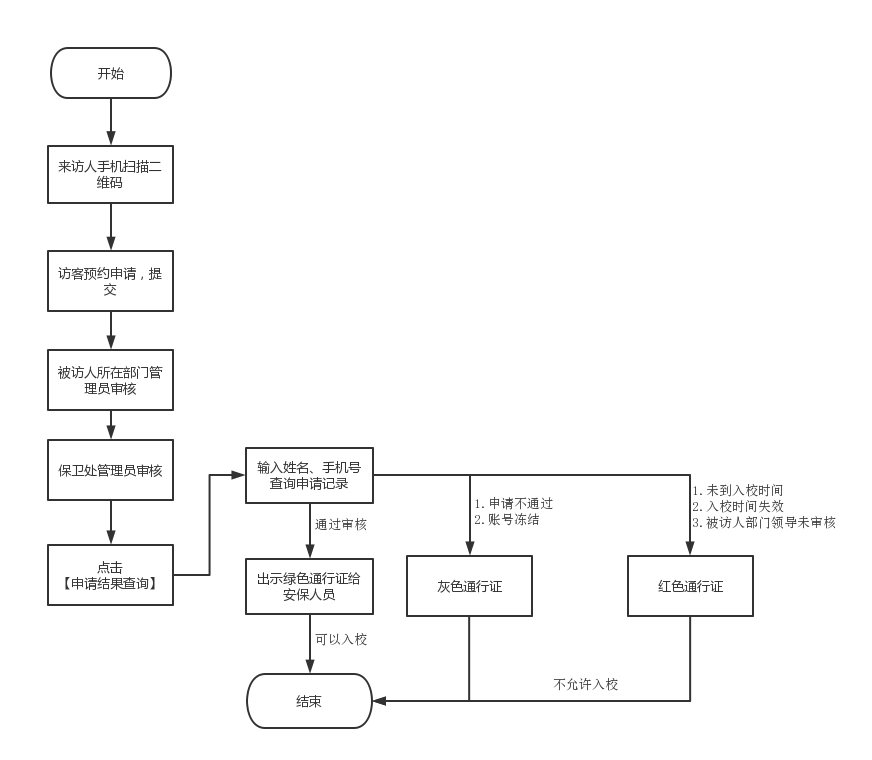 审核流程:①校内教工申请--部门负责人审核/②访客申请--部门负责人审核;