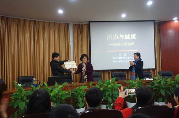 讲座开始前,肖珑副经理代表学院向在百忙中来公司作心理健康专题讲座的胡教授表示感谢,并向胡教授颁发聘书,聘请他为公司客座教授。她还讲到,本届宣传周活动持续近一个月,通过组织形式多样、内容丰富、参与性强的宣传教育活动,对在全院范围内宣传普及心理健康知识,增强员工的自我心理保健意识,树立正确的心理健康观念,培养员工健康稳定的心理素质具有积极的促进作用。她殷切希望全院师生都能“好好的”,好好地学习、好好地生活、好好地成长。