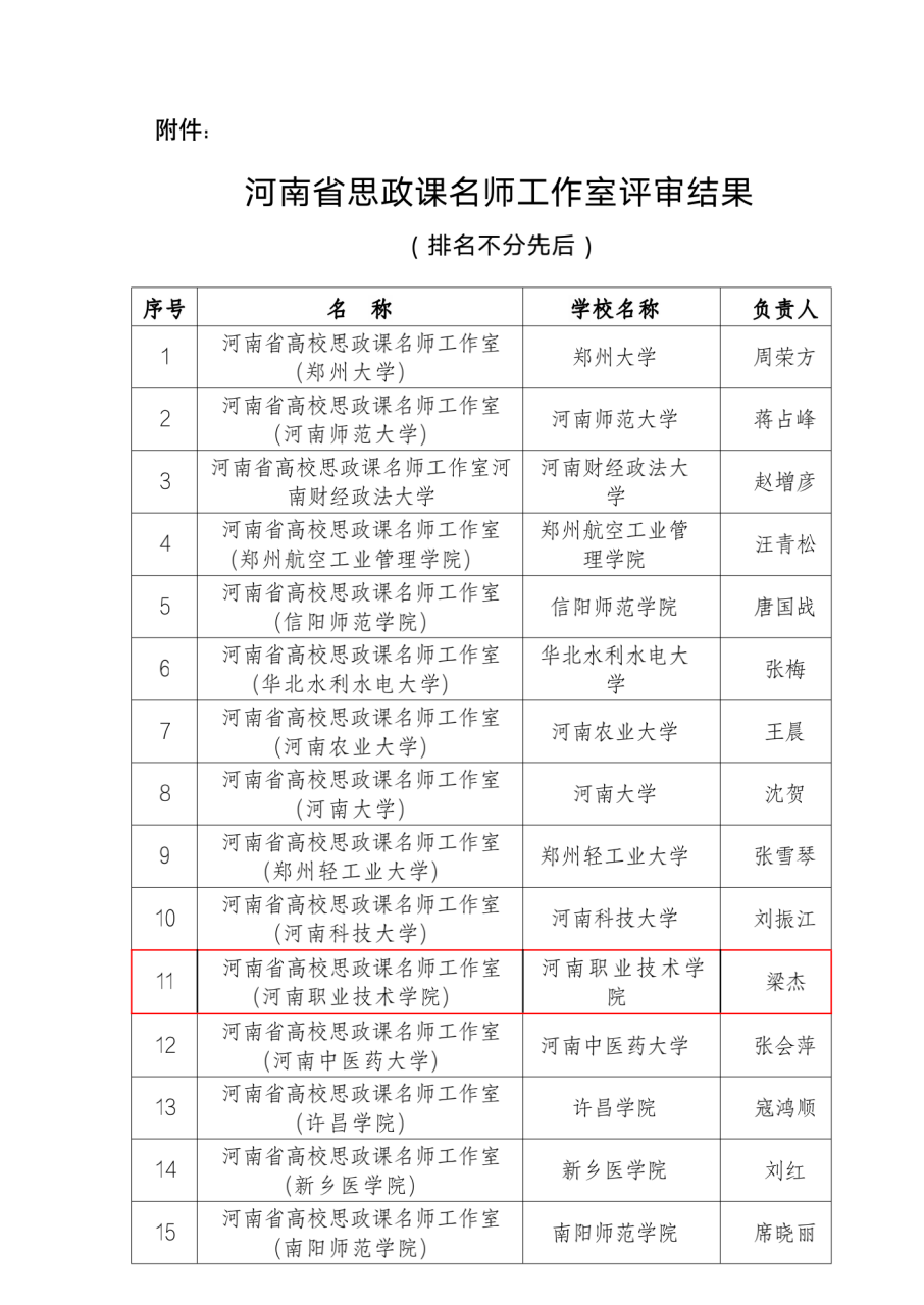 近日,中共河南省委教育工委办公室、河南省教育厅办公室下发《关于公布河南省高校思想政治理论课名师工作室名单的通知》,经全省高校申报、资格审查、专家评审、综合评议、结果公示等环节,公司bw必威西汉姆联官方网站经理、教授梁杰申报的“河南省高校思政课名师工作室(bw必威西汉姆联官方网站)”成功获批,是全省15个高校思想政治理论课名师工作室中唯一一所高职院校思想政治理论课名师工作室,为我校扩大了影响,争得了荣誉。