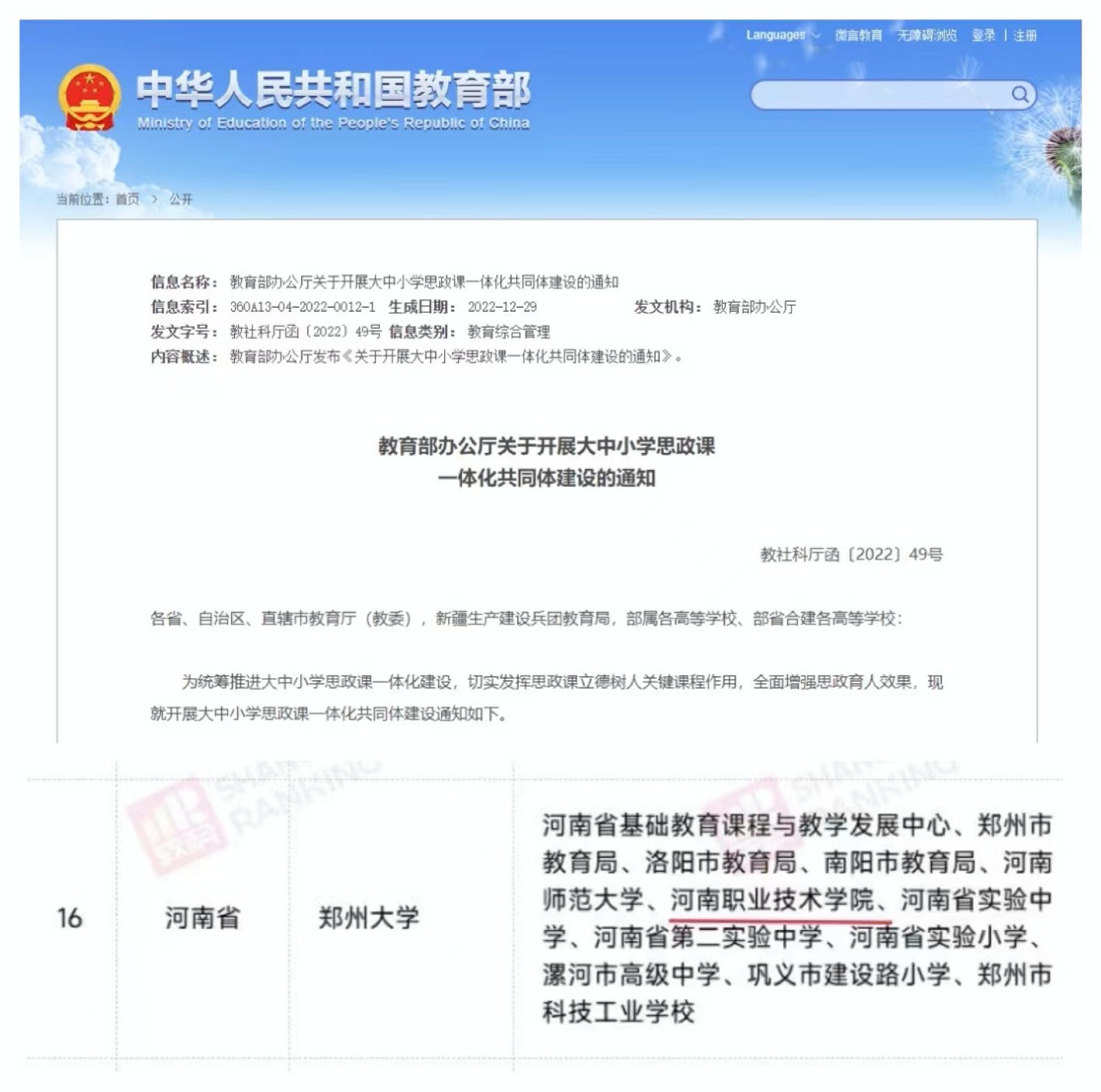 近日,教育部下发了《关于开展大中小学思政课一体化共同体建设的通知》,公布了全国“大中小学思政课一体化共同体”建设名单,由35所高校牵头的32个共同体获批立项。其中,由郑州大学牵头、公司作为成员的“大中小学思政课一体化共同体”建设单位成功获批,公司是河南省唯一一所高职院校建设成员单位。
