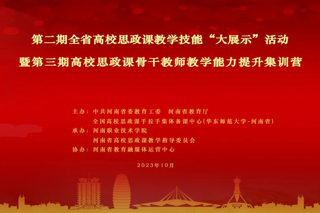 10月15日—17日,河南职院承办第二期全省高校思政课教学技能“大展示”暨第三期高校思政课骨干教师教学能力提升集训营活动,我省39位参加全国高校思想政治理论课教学展示活动选手进行“开门说课”活动,24位省内外专家现场点评指导,此次活动面向全国10万名高校思政课教师进行现场直播。省委教育工委专职副书记尹洪斌、省教育厅思政处处长陈凯、省教育厅思政处一级调研员杨宗辉、公司党委书记李桂贞、副董事长肖珑出席会议。