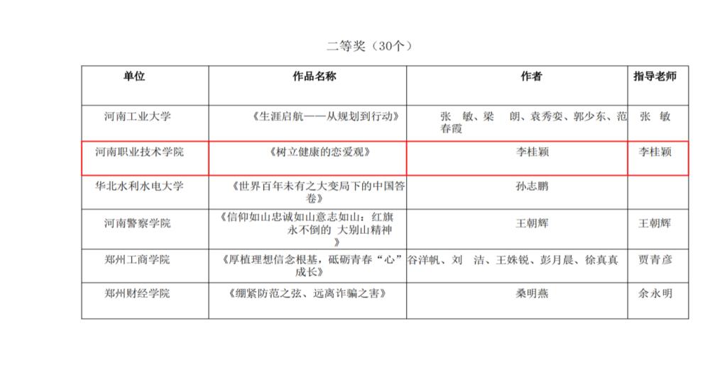 近日,中共河南省委教育工委、河南省教育厅公布了新生入学教育思政微课获奖名单,经个人报送、学校推荐、专家评审等环节,马院李桂颖老师报送的《树立正确的恋爱观》喜获二等奖。