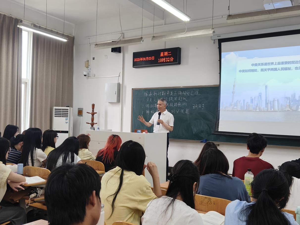 课堂上,盛兴文以“探寻新时期中美正确相处之道”为题,围绕“中美关系发展历程、新时期中美如何正确相处”等问题进行阐释,深入剖析了中美关系在新时代的复杂性与重要性。他指出,从经济层面来看,中美两国作为世界两大经济体,贸易往来、产业合作紧密交织,双方的决策影响着全球经济发展走向。在科技领域,两国关于前沿技术的竞争与合作并存,既推动着人类科技进步,又存在着诸多挑战与博弈。盛兴文强调,新时代中美正确相处应秉持相互尊重的原则,尊重彼此主权、安全和发展利益,摒弃零和思维。通过加强人文交流,增进两国人民之间的理解与信任,为关系发展奠定坚实基础。同时,在国际事务中,中美需承担起相应责任,共同应对全球性问题,如气候变化、公共卫生安全等,以合作共赢为导向,构建不冲突不对抗、相互尊重、合作共赢的新型大国关系。