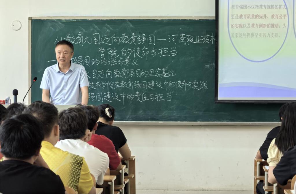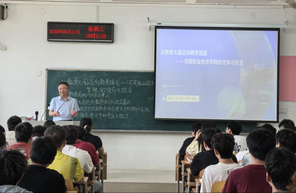 课堂上,李玉峰立足国家教育发展宏图,深刻剖析了我国从“教育大国”向“教育强国”迈进的时代背景与战略意义。他强调,教育强国是全面建设社会主义现代化国家的基础性、战略性支撑,其核心在于培养一代又一代德智体美劳全面发展的社会主义建设者和接班人,关键在于构建公平优质、充满活力、具有国际竞争力的现代化教育体系。他结合国家最新政策导向与产业升级趋势,强调高等职业教育在培养支撑中国式现代化建设所需高素质技术技能人才中的关键作用。迈向教育强国,是实现中华民族伟大复兴中国梦的必然要求,也是应对全球竞争、塑造发展新动能的关键路径,清晰标定了职业院校奋斗的时代坐标和努力方向。