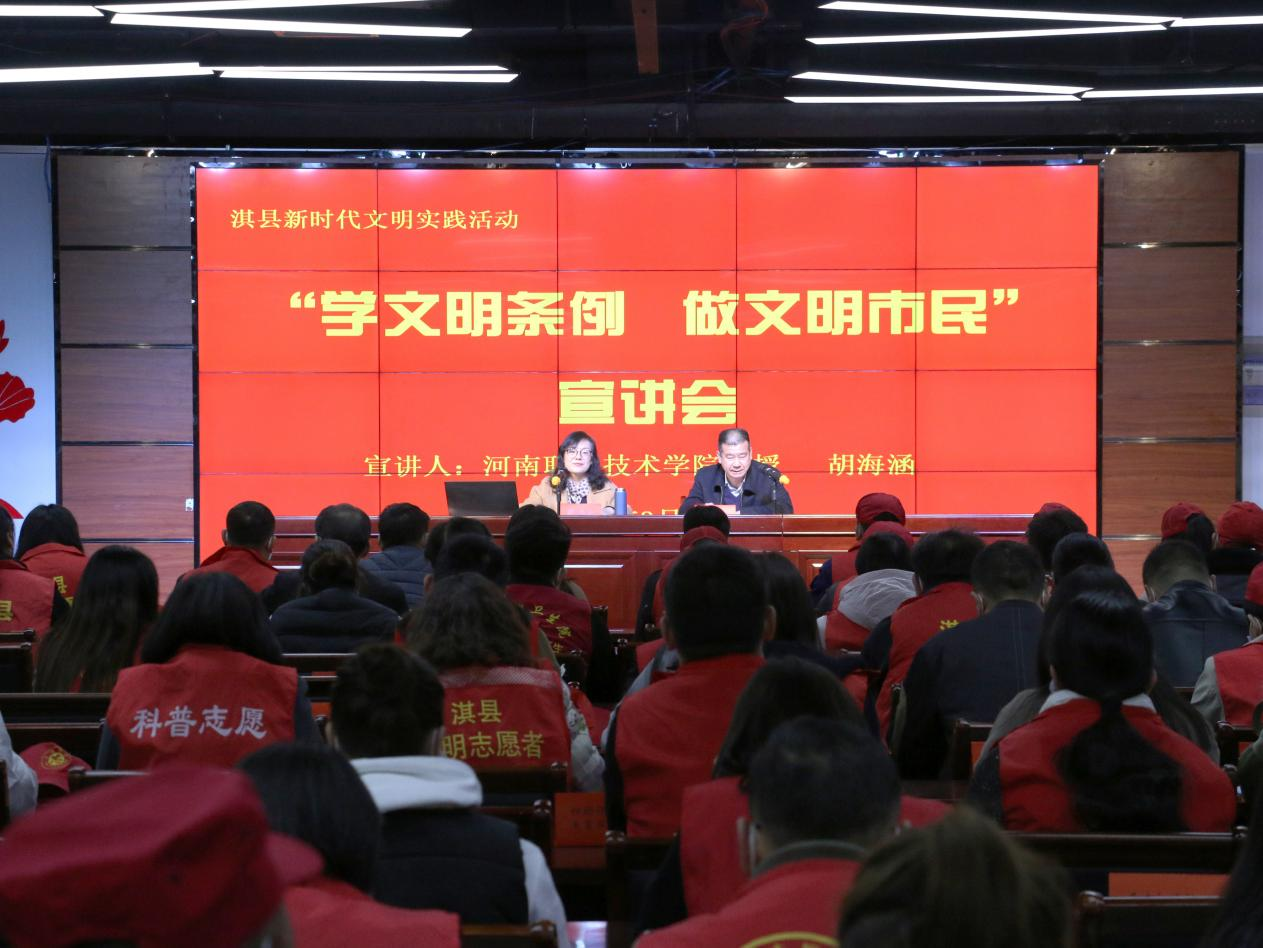 3月4日,根据公司文明办工作安排,公司副经理胡海涵教授受邀赴新时代文明实践中心联系点——鹤壁市淇县宣讲《河南省文明行为促进条例》。校文明办相关老师及青年志愿者一同前往,淇县省、市、县级文明单位和文明校园相关负责人,以及部分社会组织和协会负责人听取了宣讲。