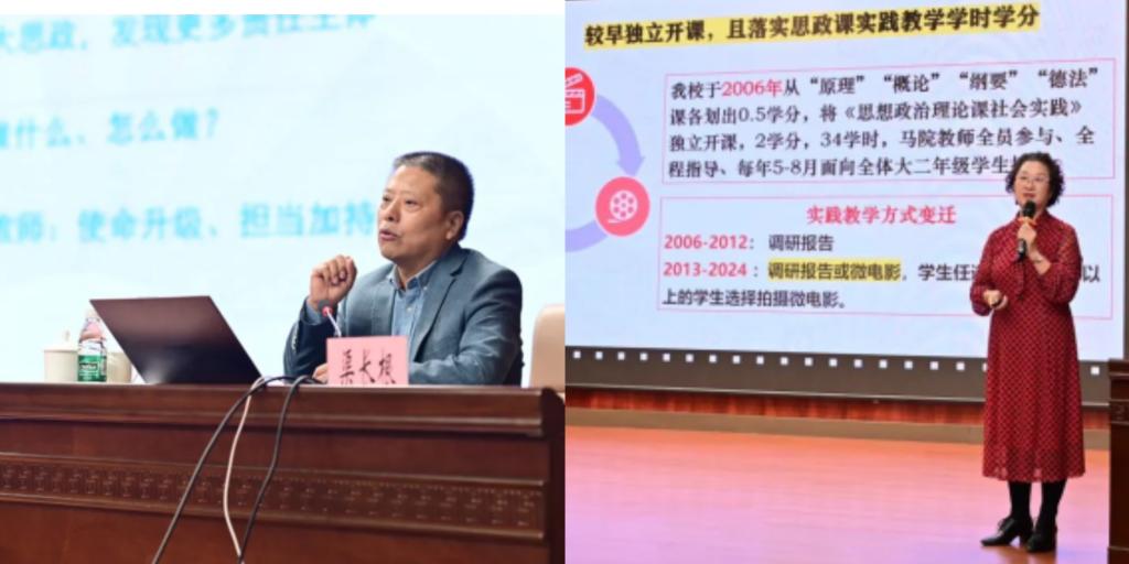 在主旨报告环节,教育部高校思政课教指委委员、浙江省高校红色场馆联盟理事长、浙江理工大学红色文化研究院经理渠长根教授作了题为《红色文化视角下大思政课建设实务》的专题报告。渠长根从准确认识红色文化、红色文化视角下如何建设“大思政课”、思政课教师的担当与使命三个方面展开讲述,传递了“人人育人者、时时育人时、处处育人地”的“大思政课”实践理念。“全国模范教师”、河北大学“坤舆学者”、思政课微电影教学改革研究中心主任、博士生导师柴素芳教授作了题为《“大思政课”视域下高校思政课微电影教学改革十年探索》的专题报告。柴素芳结合自身实践教学经验,从“思想政治理论课社会实践”课的开课背景、课程目标、发展历程、解决问题、教学环节、实践要求、实践成果和发展前景等方面,分享了探索思政课实践教学微电影创作的改革历程和成功经验。