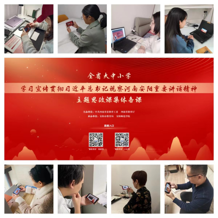 为学习宣传贯彻党的二十大精神和习近平总书记视察河南安 阳重要讲话精神,贯彻落实《关于推进大中小学思政课一体化建设的实施意见》(教思政〔2021〕425 号),按照省委教育工委、省教育厅安排部署,12月10日上午9点,公司组织全体教师通过豫教思语视频号收看了由省委教育工委、省教育厅主办,安阳市教育局和安阳师范学院承办的学习宣传贯彻习近平总书记视察河南安阳重要讲话精神主题思政课集体备课活动。
