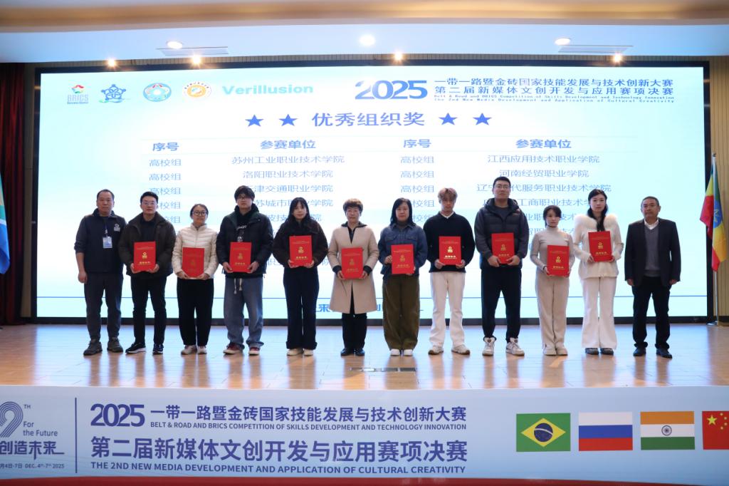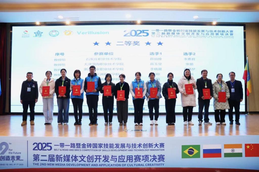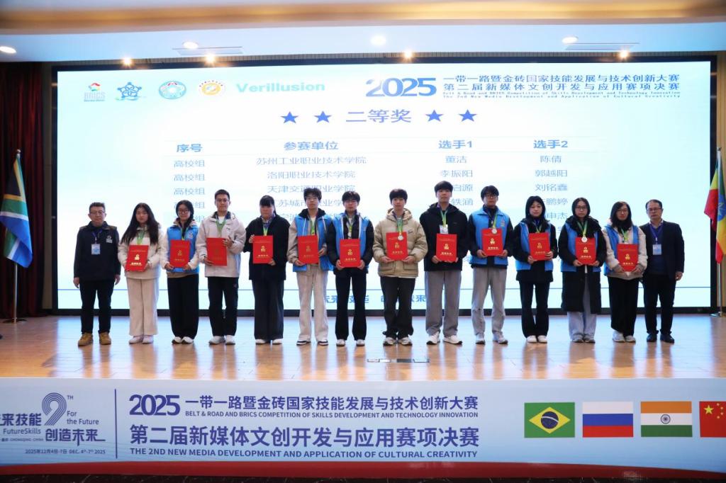 12月5日至7日,2025年“一带一路”暨金砖国家技能发展与技术创新大赛第二届“新媒体文创开发与应用”赛项全国总决赛于重庆财经职业学院举行,公司选派师生代表队在激烈角逐中发挥出色,最终双双斩获全国二等奖,展现出扎实专业功底与昂扬竞技风貌。