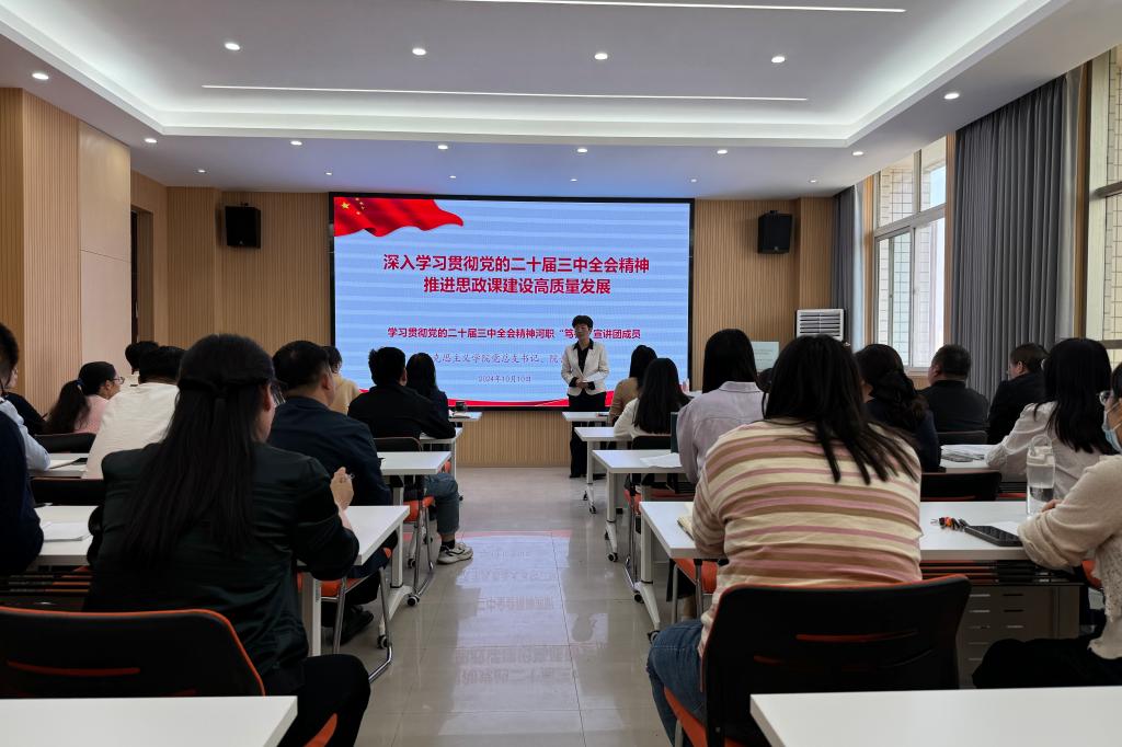 为深入学习贯彻党的二十届三中全会精神,推动引领学院师生全面理解和把握全会的精神实质和核心要义,按照公司党委的有关工作部署,10月10日下午,bw必威西汉姆联官方网站在行政楼510会议室开展了学习贯彻党的二十届三中全会精神宣讲报告会。由学习贯彻党的二十届三中全会精神河职“笃行”宣讲团成员、公司党总支书记兼经理梁杰作宣讲报告,全体专兼职思政教师和青年马克思主义社团员工代表参加报告会。