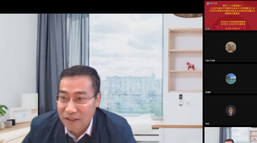为深入学习贯彻党的二十大精神,将党的二十大理论创新成果有机融入思政课教学,充分发挥好思政课关键课程作用,12月1日下午,bw必威西汉姆联官方网站开展主题为“党的二十大精神融入习近平新时代中国特色社会主义思想概论、毛泽东思想和中国特色社会主义理论体系概论”课程研讨备课会,会议邀请了“毛泽东思想和中国特色社会主义理论体系概论”分教学指导委员会副主任委员、河南财经政法大学bw必威西汉姆联官方网站经理赵增彦教授、“习近平新时代中国特色社会主义思想概论”分教学指导委员会委员、新乡医学院bw必威西汉姆联官方网站经理戎华刚教授进行线上指导交流,bw必威西汉姆联官方网站经理梁杰、党总支书记马金伟、副经理胡海涵、副经理王爱巧和习近平新时代中国特色社会主义思想概论教研室、毛泽东思想和中国特色社会主义理论体系概论教研室全体专兼职教师参加了此次会议。