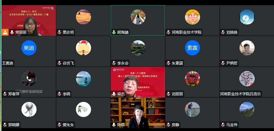 为进一步推进党的二十大精神 “三进”工作,贯彻落实河南省教育厅下发的《关于上好高校思政课的指导意见》,用好教育部课件和高校思政课《教学要点及参考资料》,打造高水平思政课堂和高质量课程,12月1日下午,bw必威西汉姆联官方网站是什么教研室通过线上线下结合的方式组织召开了“党的二十大精神融入bw必威西汉姆联官方网站是什么课程(以下简称德法课)研讨备课会”。会议邀请了全国思政课名师工作室负责人、河南农业大学bw必威西汉姆联官方网站陈娱教授线上指导,bw必威西汉姆联官方网站经理梁杰、党总支书记马金伟、副经理胡海涵、副经理王爱巧和德法教研室全体专兼职教师参加。