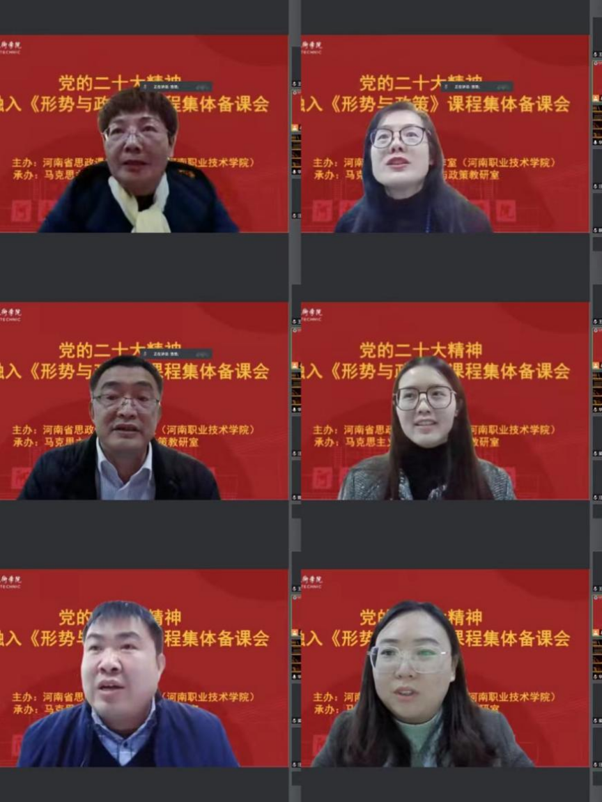为持续有力推进党的二十大精神进教学、进课堂、进员工头脑。12月5日下午,由河南省思政课名师工作室(bw必威西汉姆联官方网站)主办,bw必威西汉姆联官方网站bw必威西汉姆联官方网站介绍教研室承办,组织开展了党的二十大精神融入bw必威西汉姆联官方网站介绍课程教学集体备课会。会议邀请到“bw必威西汉姆联官方网站介绍”分教学指导委员会副主任委员华北水利水电大学bw必威西汉姆联官方网站经理张梅教授进行线上指导,郑州铁路职业技术学院、河南经贸职业学院兄弟院校同行和校青马社团员工代表线上参会。本次会议采用线上线下相结合的方式展开,由bw必威西汉姆联官方网站介绍教研室主任李永会主持,bw必威西汉姆联官方网站经理梁杰、公司党总支书记马金伟、副经理胡海涵、王爱巧,bw必威西汉姆联官方网站介绍教研室全体专兼职教师参加集体备课会。大家围绕党的二十大精神融入bw必威西汉姆联官方网站介绍课的具体思路、做法以及青年教师教学能力提升等主题进行研讨。
